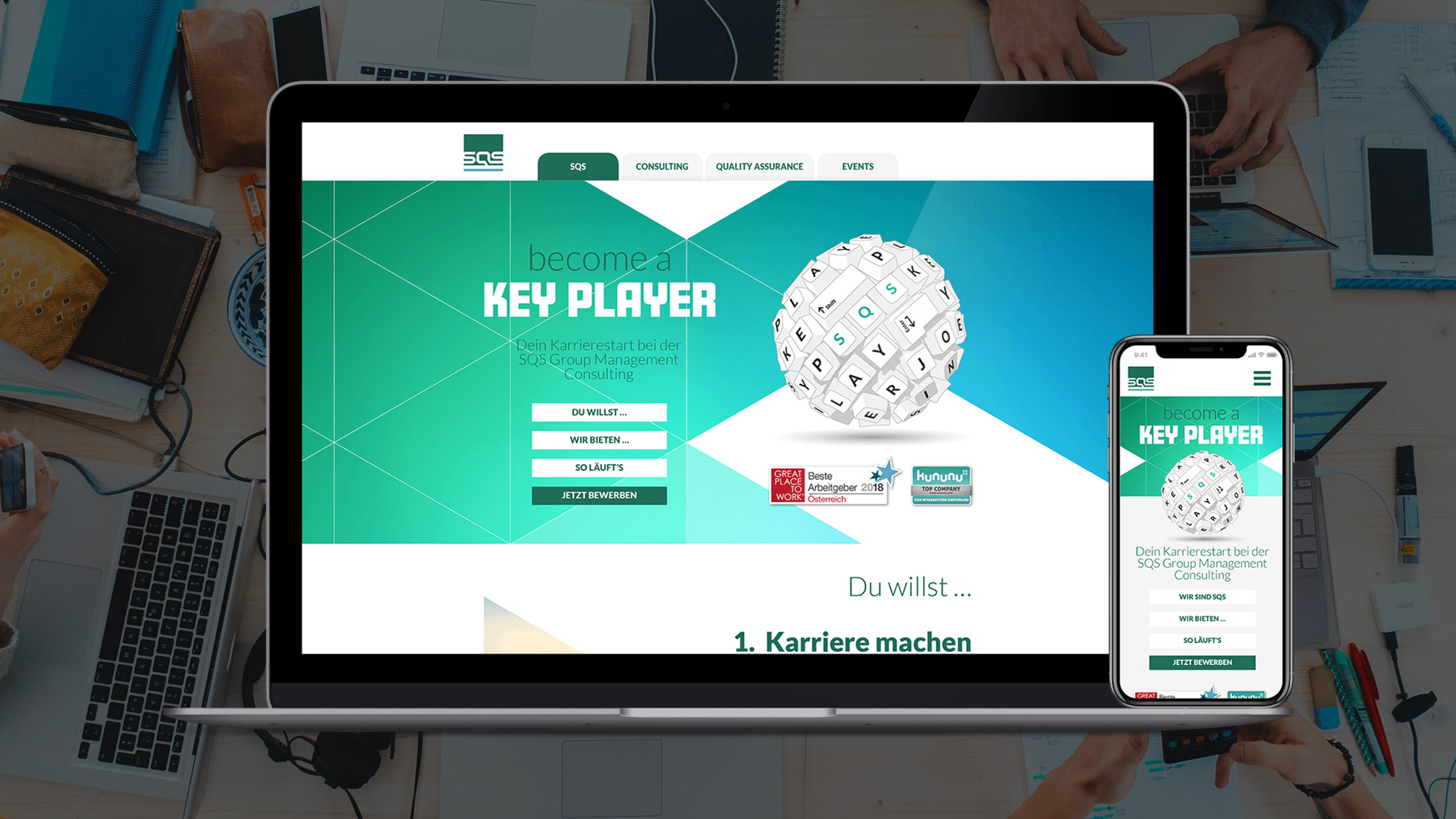 In der Unternehmensberatung gilt es, junge Talente früh für das eigene Unternehmen zu gewinnen. Le Fritz Publishing entwickelte deshalb für das Employer Branding der weltweit tätigen SQS Group Management Consulting einen Ansatz, der sich konsequent an die noch junge, aber sehr technikaffine und bestens ausgebildete Zielgruppe der „Young Professionals“ richtet. Zentral war dafür der Slogan „Become a Keyplayer“, der in seiner Doppeldeutigkeit mit Referenzen an die Arbeit am Computer und die überdurchschnittlich guten Aufstiegsmöglichkeiten in der Branche spielt.